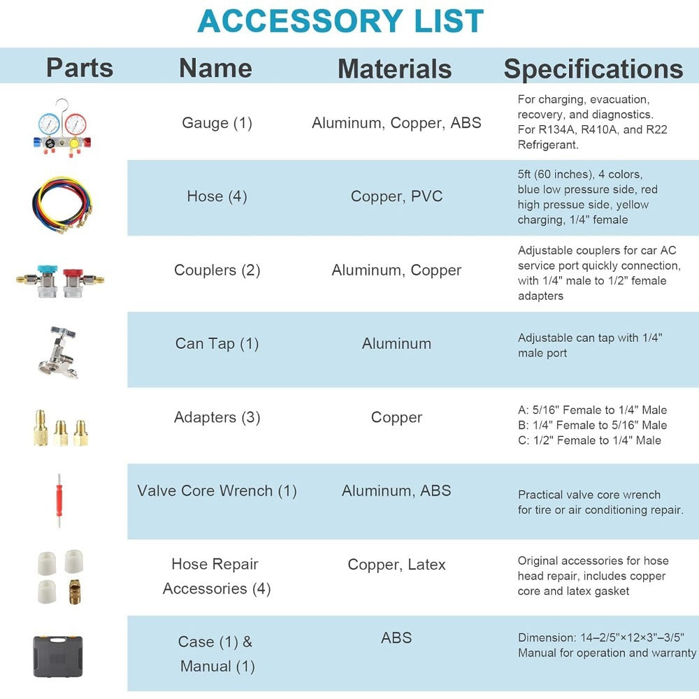 • This car AC gauge set works with R134a, R22, and R410a refrigerants.